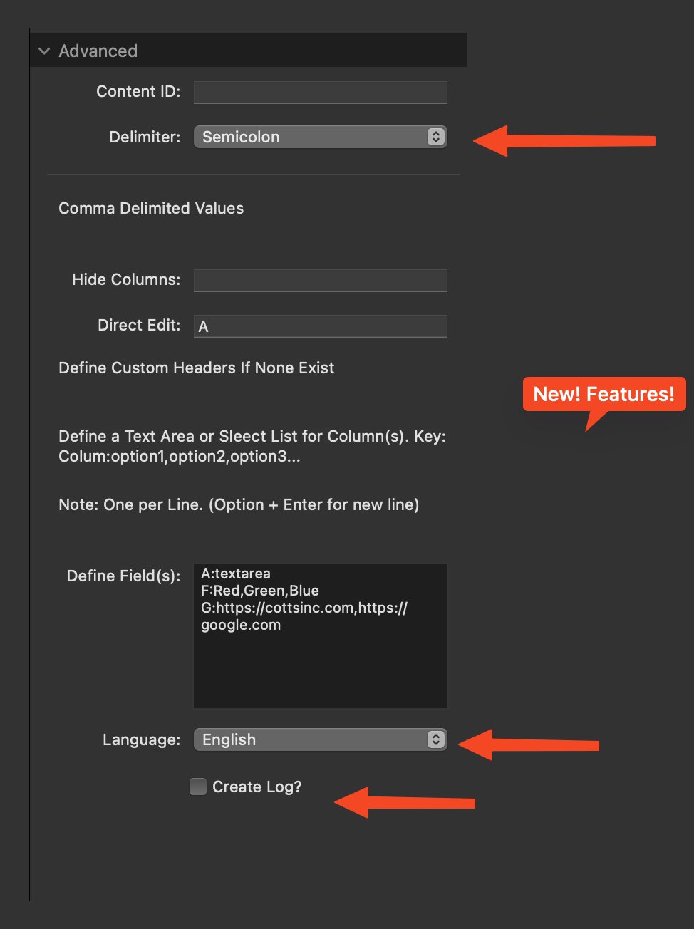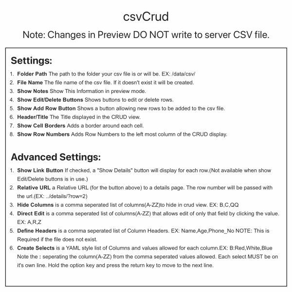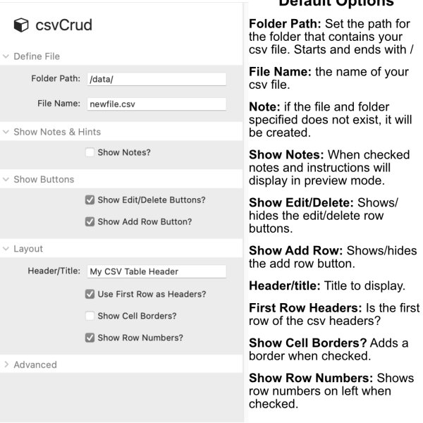 - Add a csvCrud stack (only one per page) to your page.
