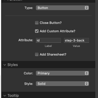 - Section Buttons: Each section requires a "Step Complete Button. Use the F6 Button Group plain button(not link). Add a Custom Attribute of id with a value of step-N-complete where N is the current step. If needed you can also add a "Back" button. The custom attribute id would be: step-N-back. The final form step will need a normal submit button.