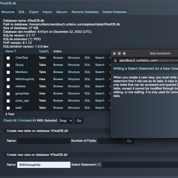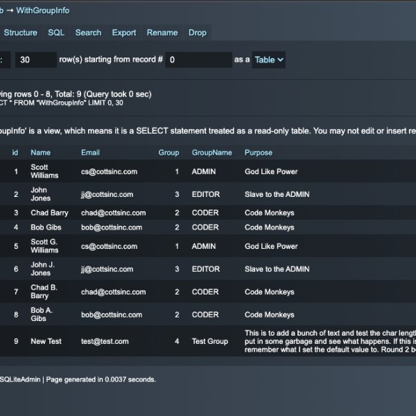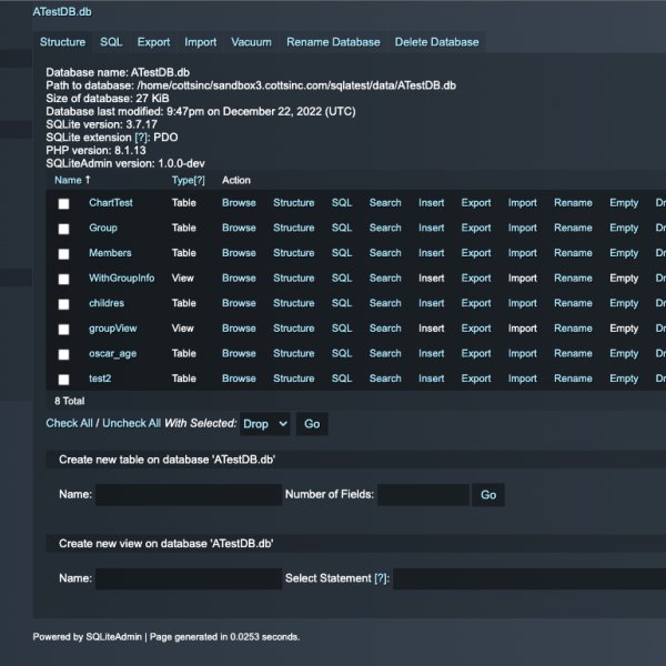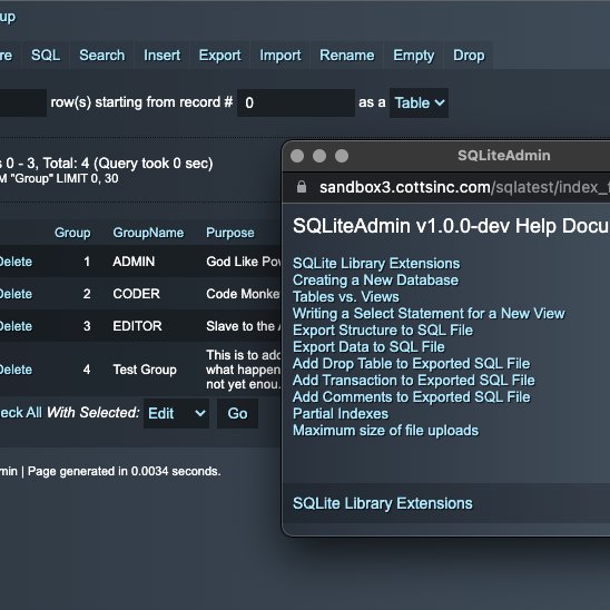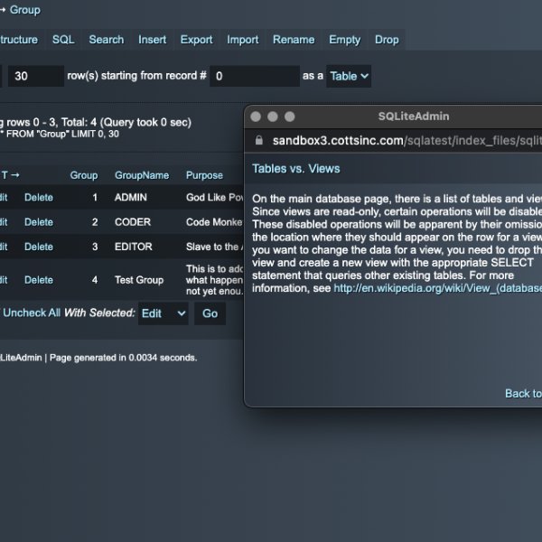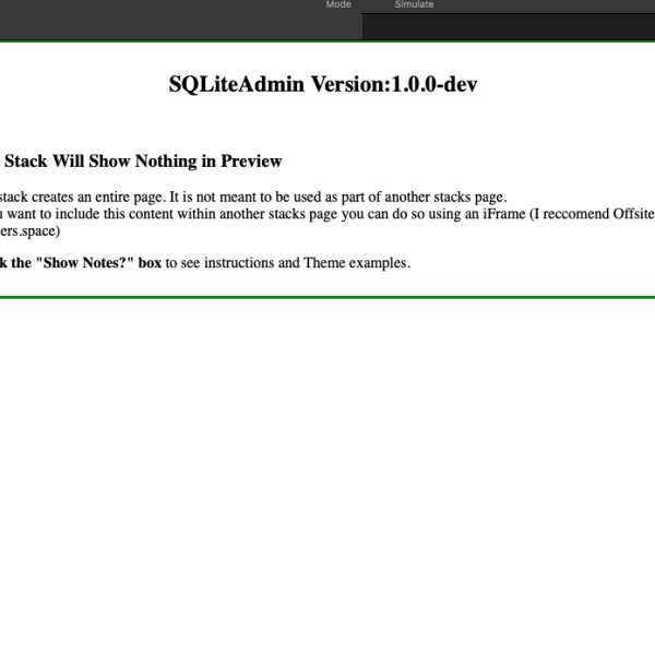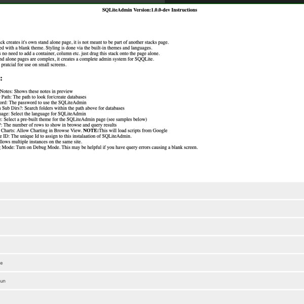 SQLiteAdmin is a very powerful stack with an enormous list of features. It allows you to create a complete Admin system for the SQLite database system. This is a perfect complement to FEEDS Database Pack by Weavers.space. FEEDS lets you display data on your web pages formatted to your liking. SQLiteAdmin lets you create the data, Edit the data etc. You can create a view of data from multiple tables that are joined. and use FEEDS to filter, sort and display this multi table data. You can also Query the data directly via FEEDS SQL Querry field.